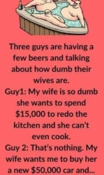 Three guys are having a few beers and talking about how dumb their wives are. Guy1: My wife is so dumb she wants to spend