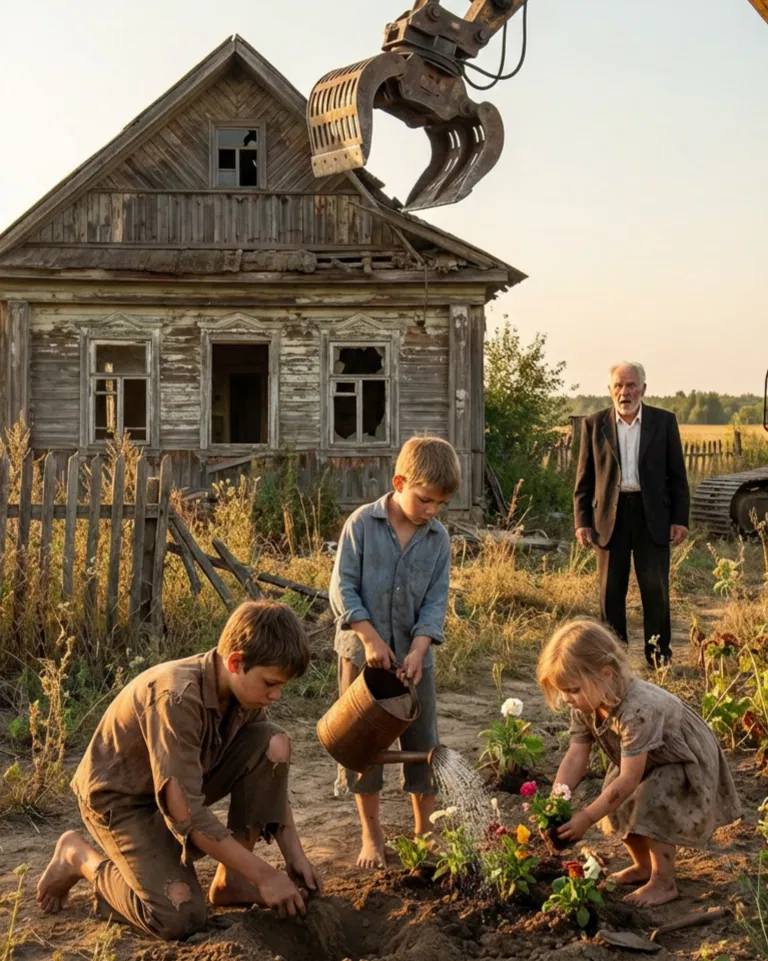 The oldest was a boy of about twelve, tall and serious, dirt smudged across his hands. Beside him, a younger boy—maybe nine—carefully arranged flowers into a small basket. And near them stood a little girl, no older than six, wearing a faded blue dress and holding blooms almost bigger than her hands.