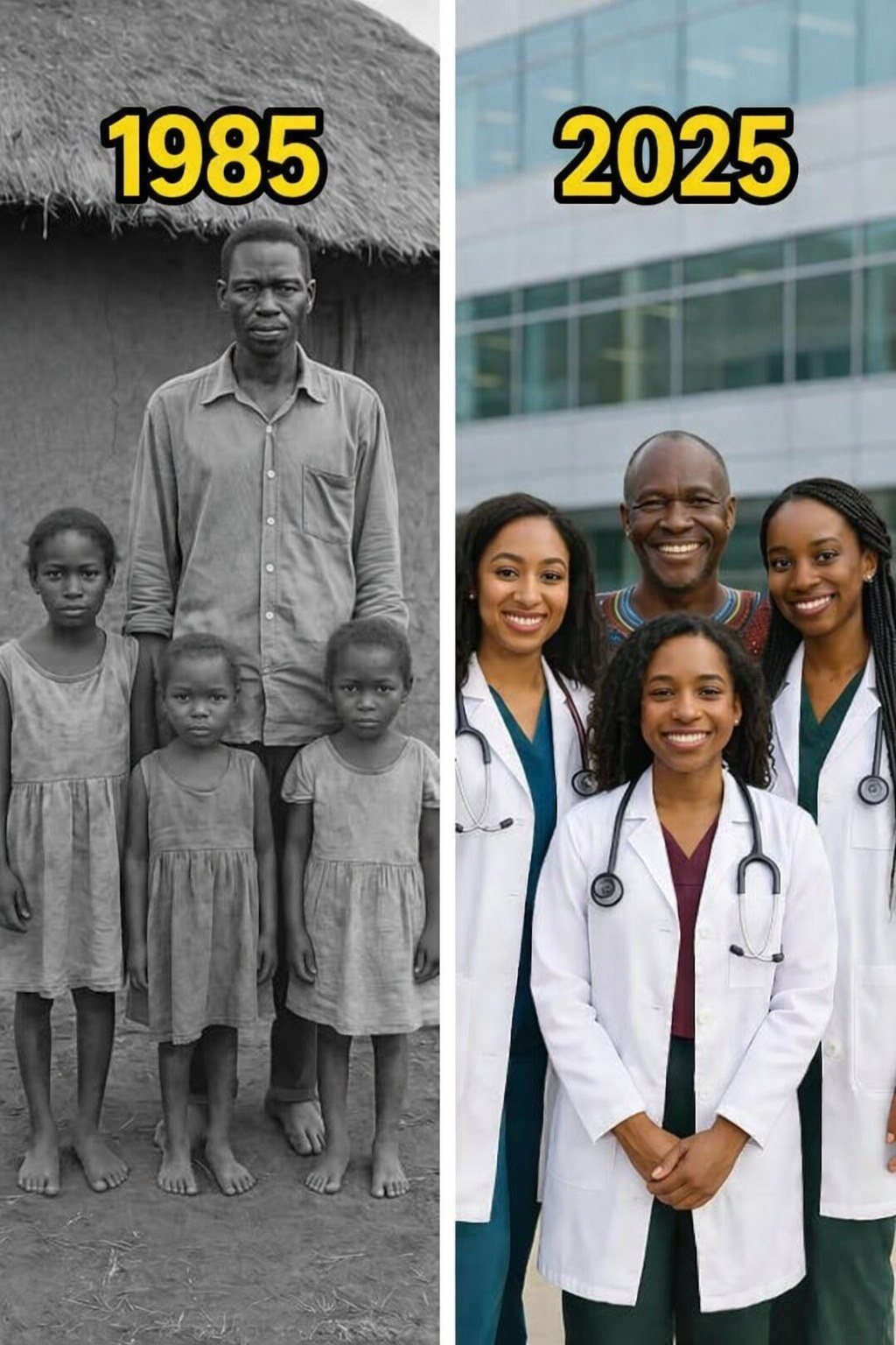 Fast forward to 2025, forty years after that original photograph was taken. The world saw something that no one could have anticipated. A new image emerged—one that symbolized the triumph of determination and the power of a father’s love. Daniel, now older, stood proudly in front of a hospital. This time, he wasn’t standing with his daughters in simple dresses, barefoot on the dusty ground. They were standing together as accomplished professionals—doctors, all of them. They wore white coats, symbolizing the culmination of years of hard work, sacrifice, and perseverance.