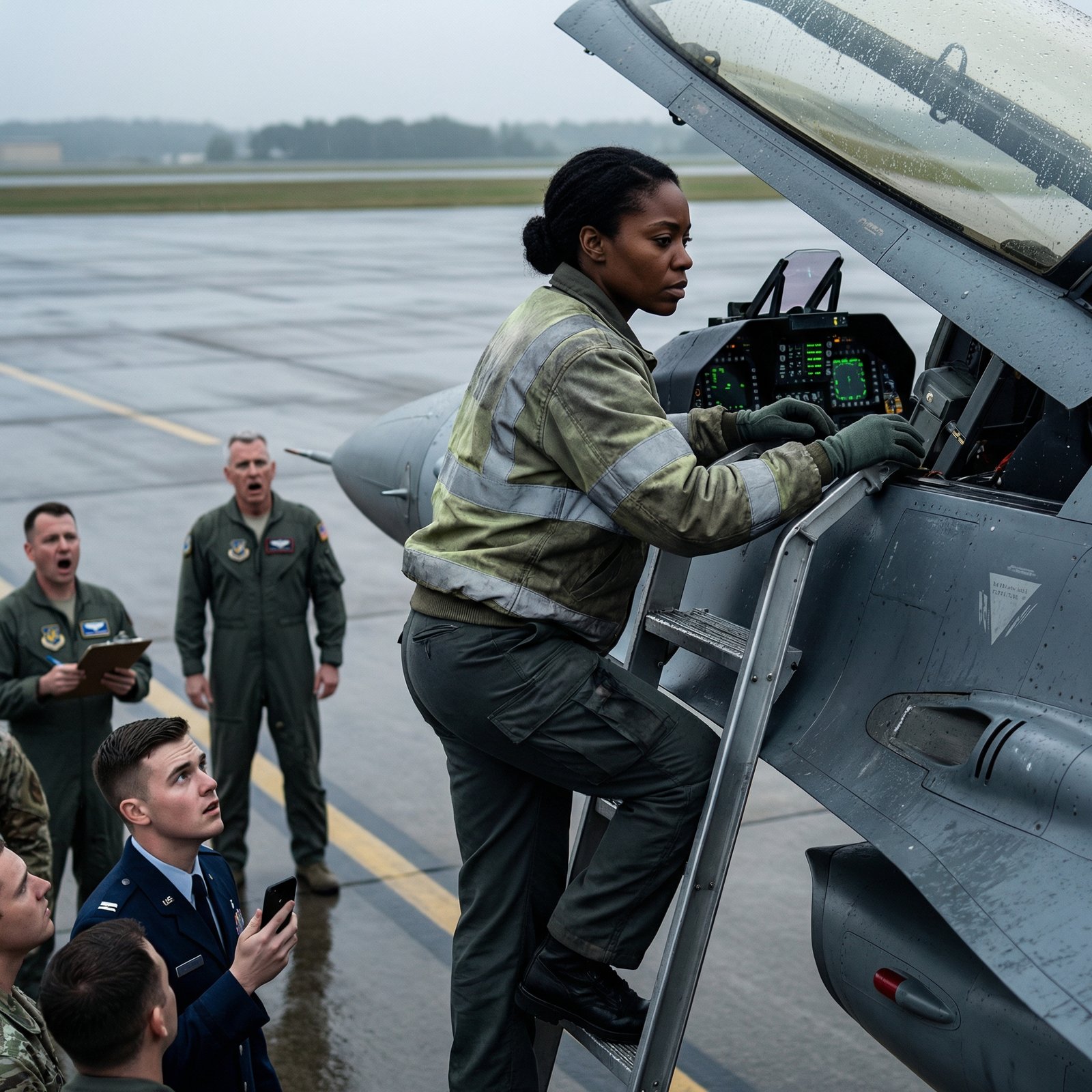 Within minutes, Renee was escorted onto the tarmac to an F-16 parked for routine systems checks. A few phones appeared, discreetly recording. Vance climbed the ladder first, then turned and motioned for Renee like it was a stage.